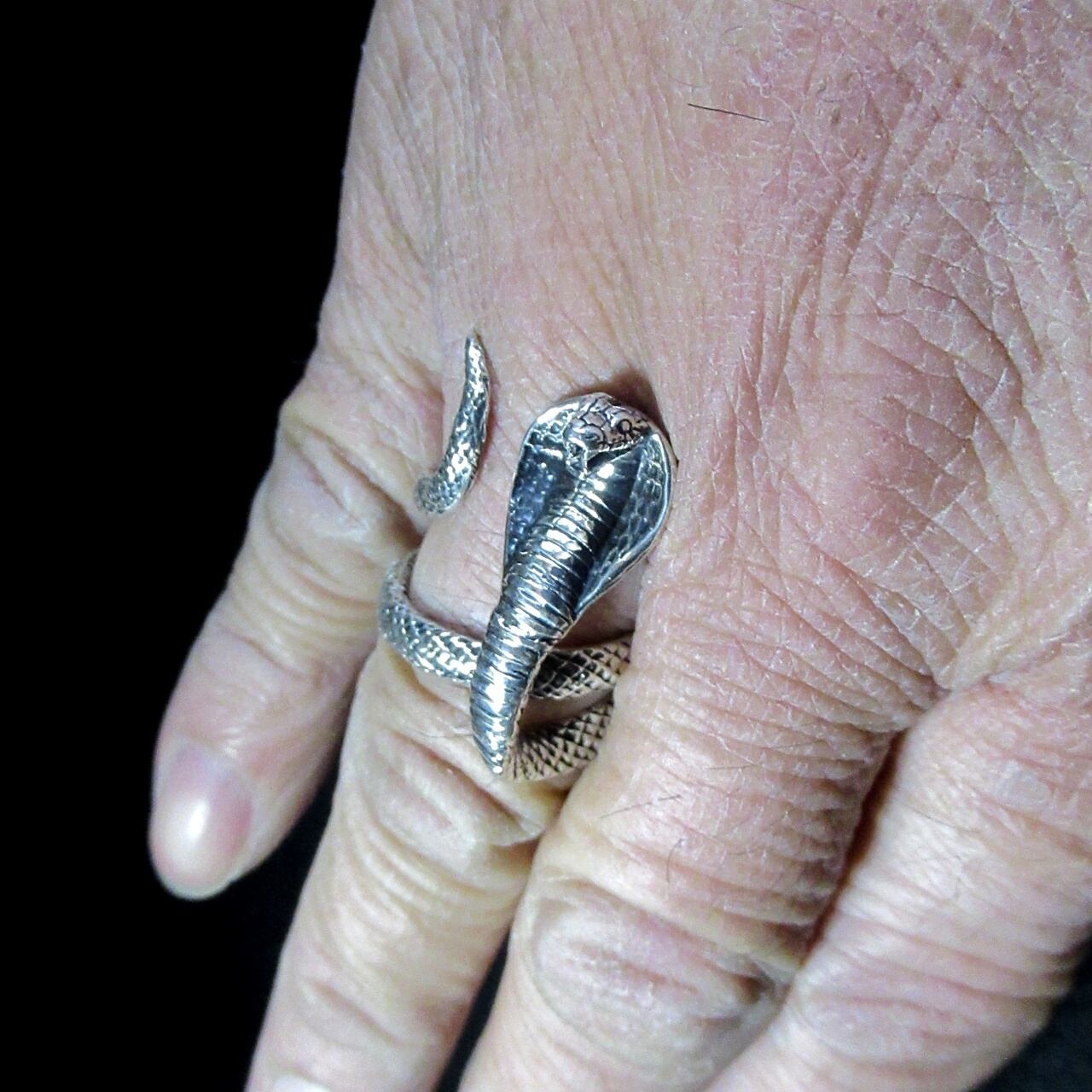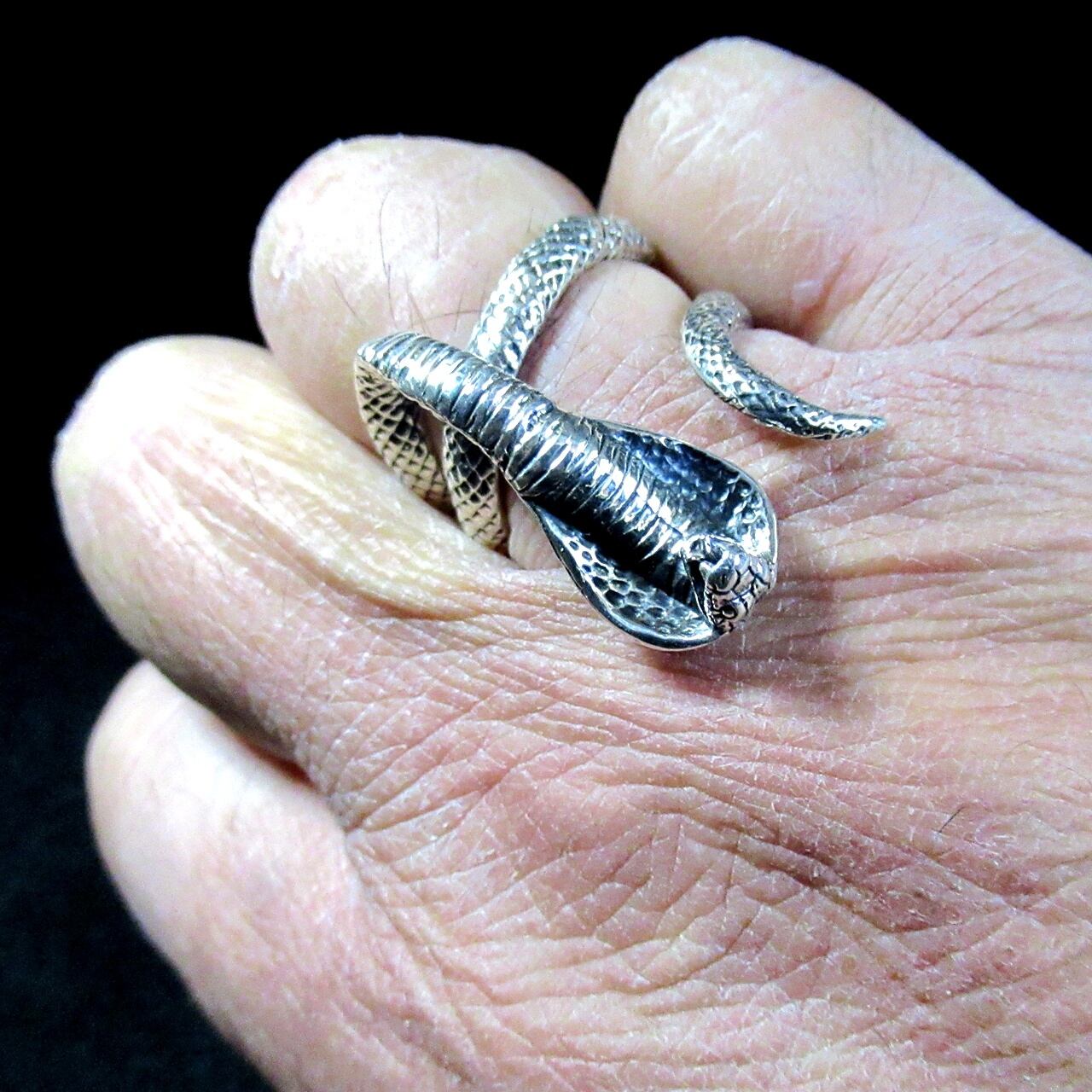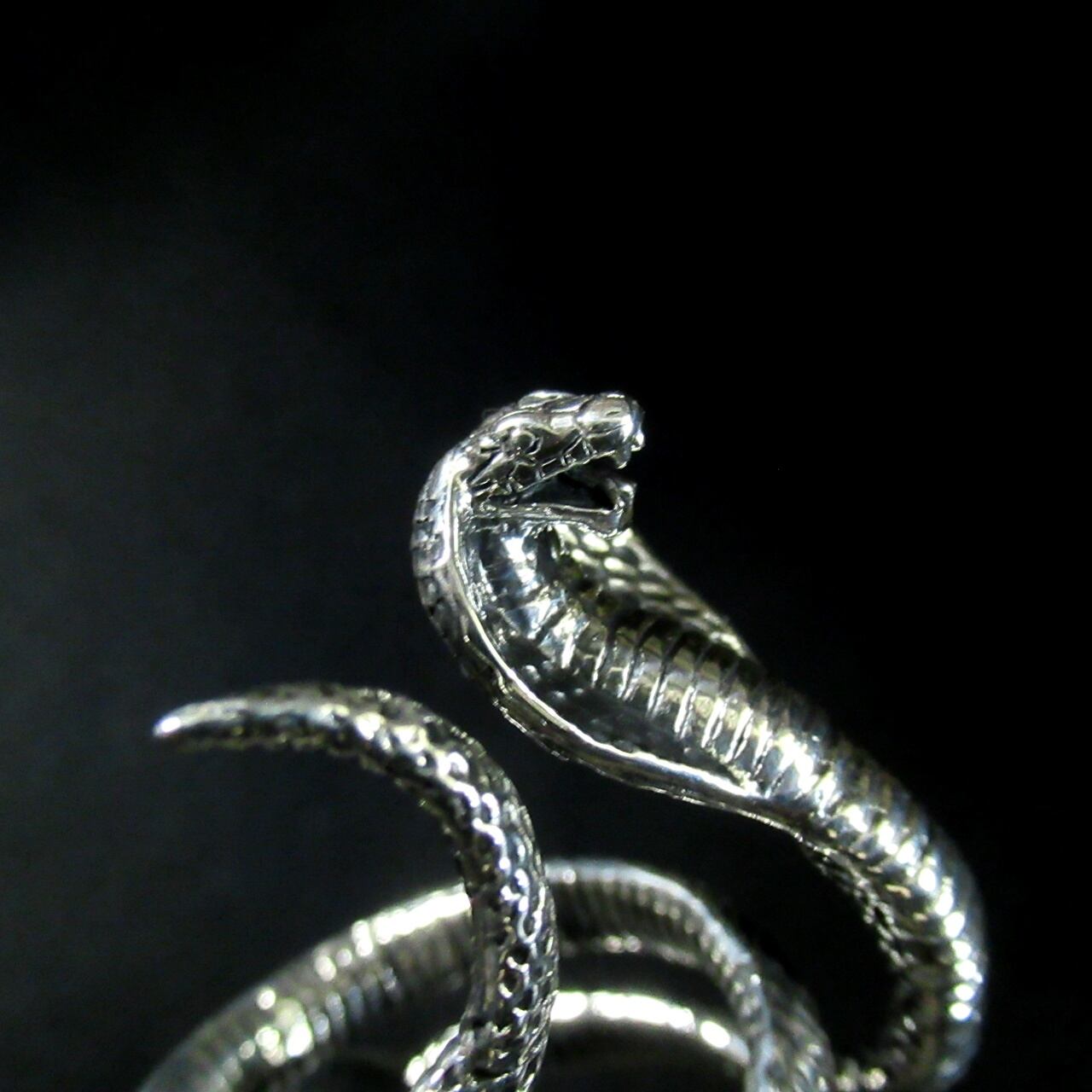 コブラが指に巻き付く感じがリアルなリングは、職人が鱗一つ一つ丁寧に創り込み腹部の襞までリアルに再現されています。