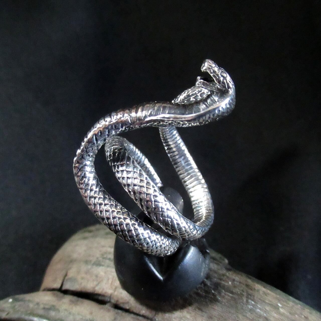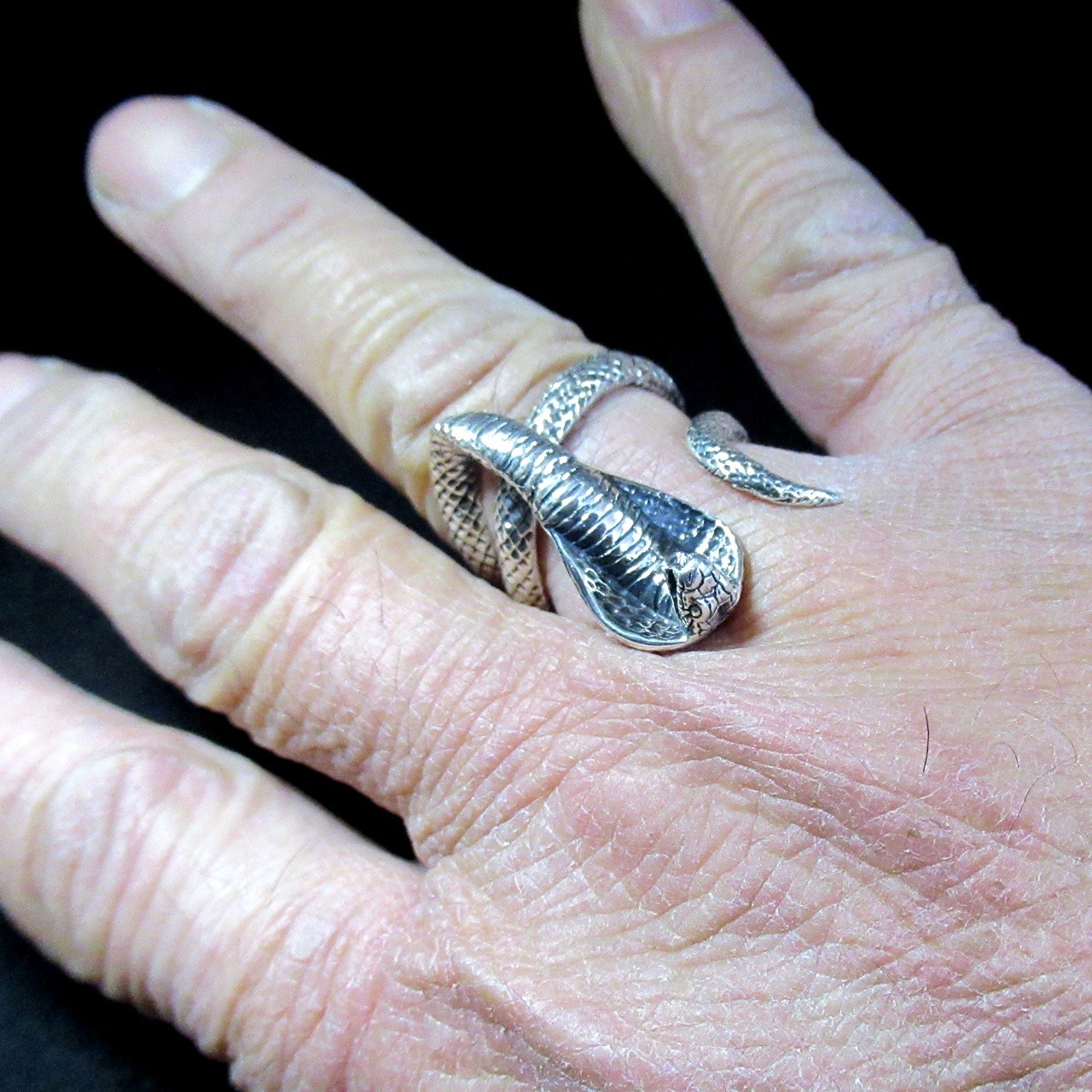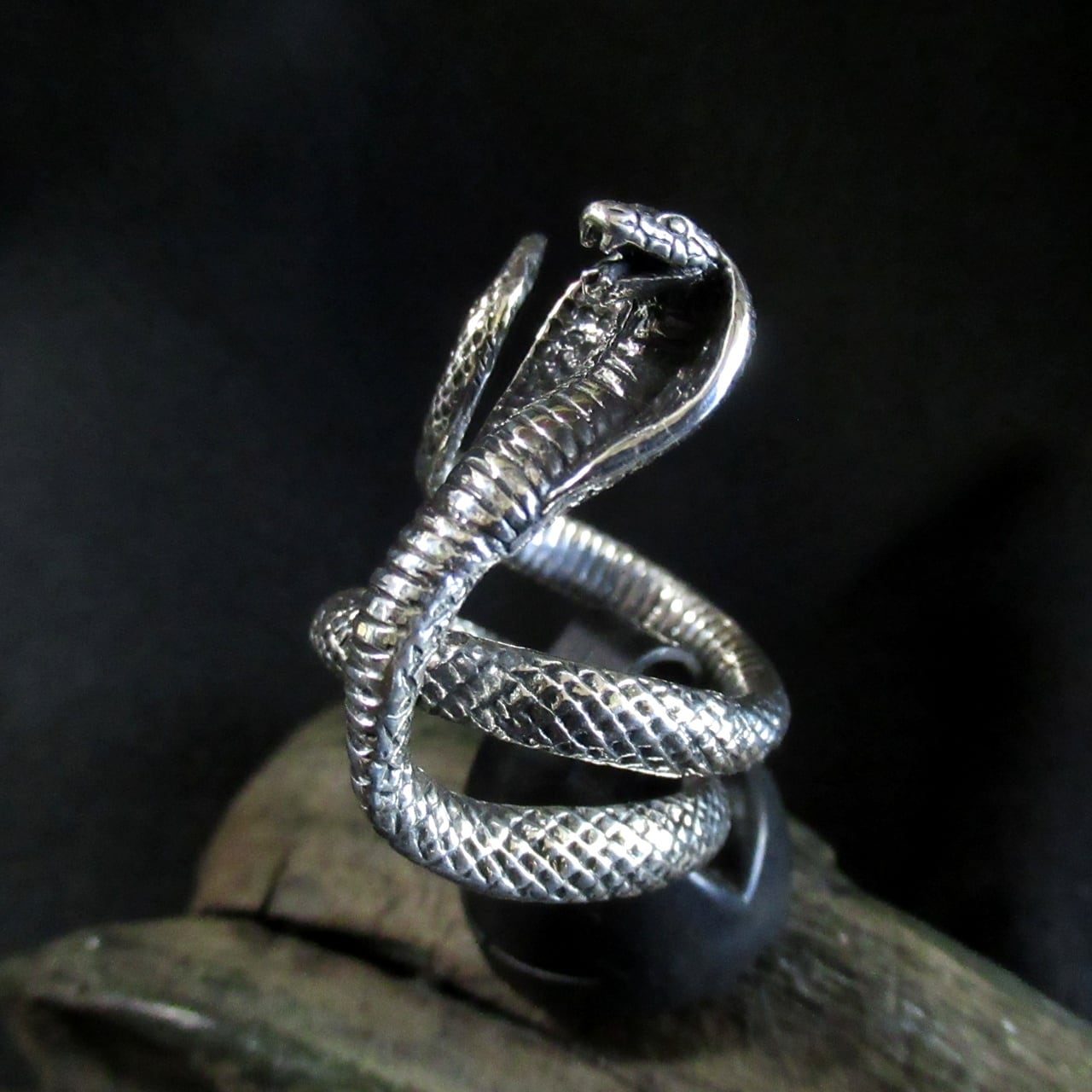 コブラが指に巻き付く感じがリアルなリングは、職人が鱗一つ一つ丁寧に創り込み腹部の襞までリアルに再現されています。