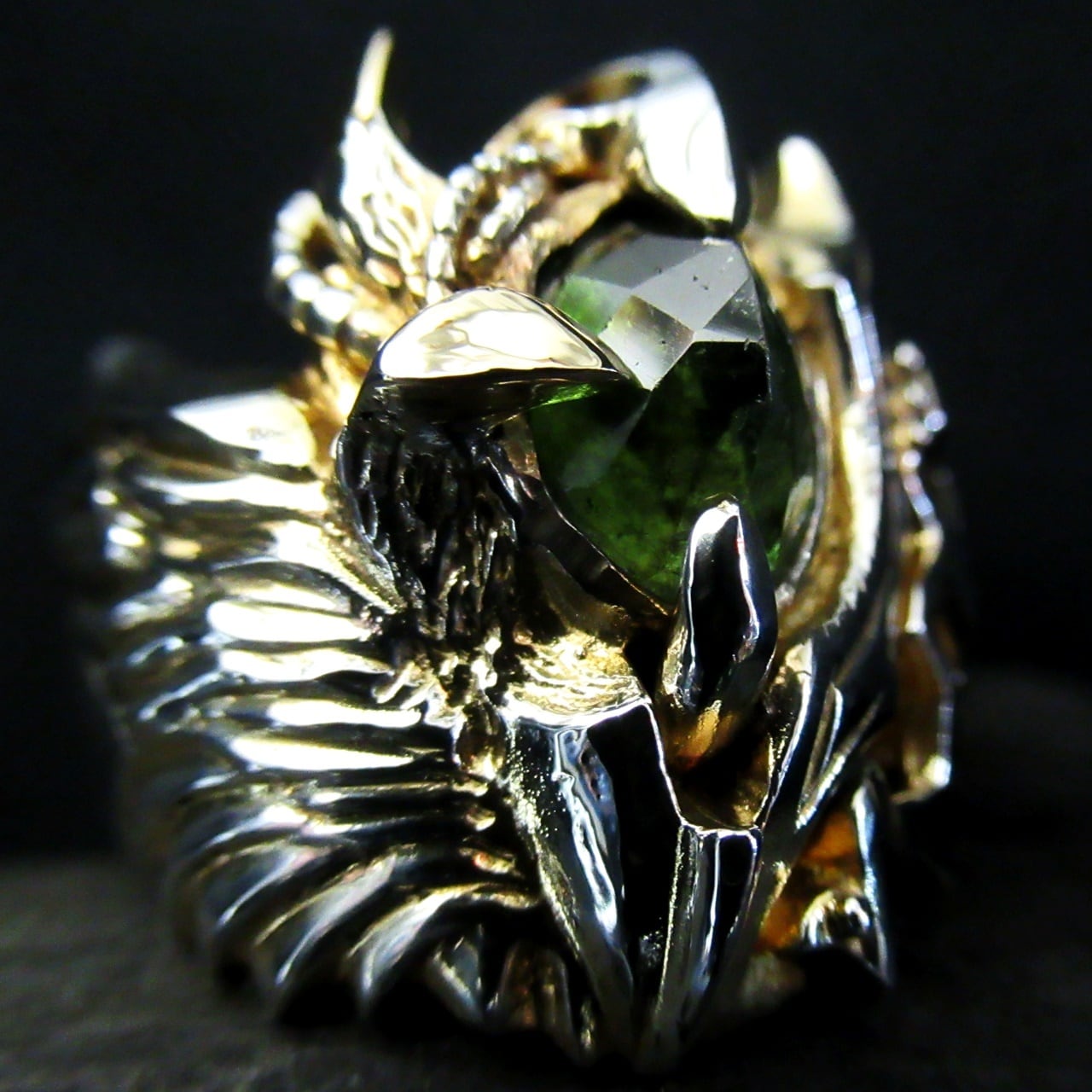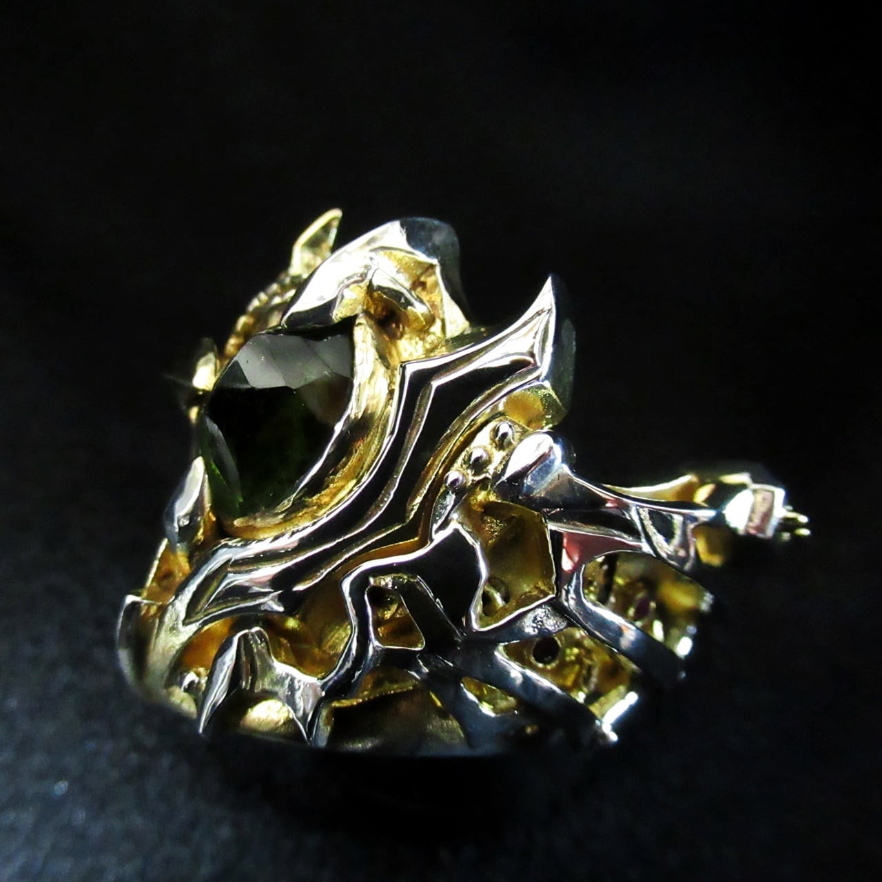 その上から全体をゴールドのコーティングを施し、グリーンとゴールドのコントラストが美しいゴージャスなリングに仕上げました