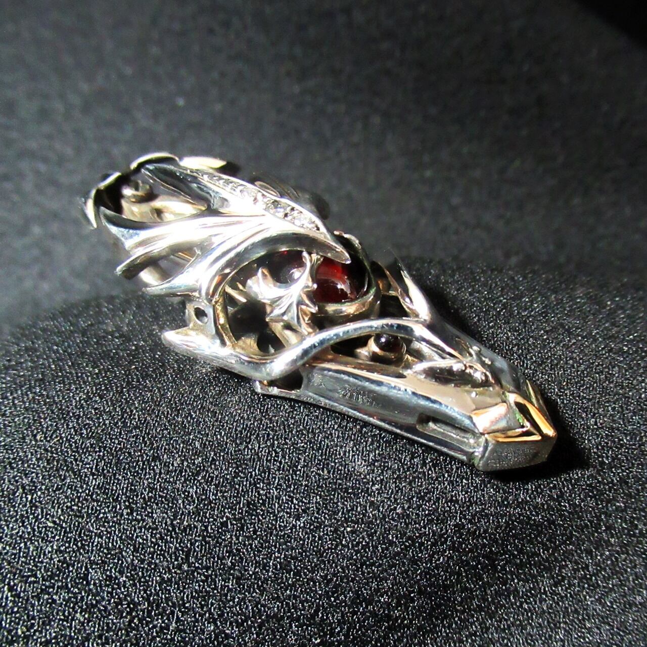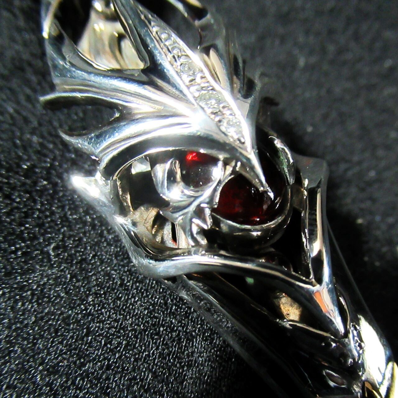 丸いカボションカットの石を使いあえて鈍く光る一つ目のワイバーンの瞳が、見る角度により光り方の違う表情を見せてくれます!