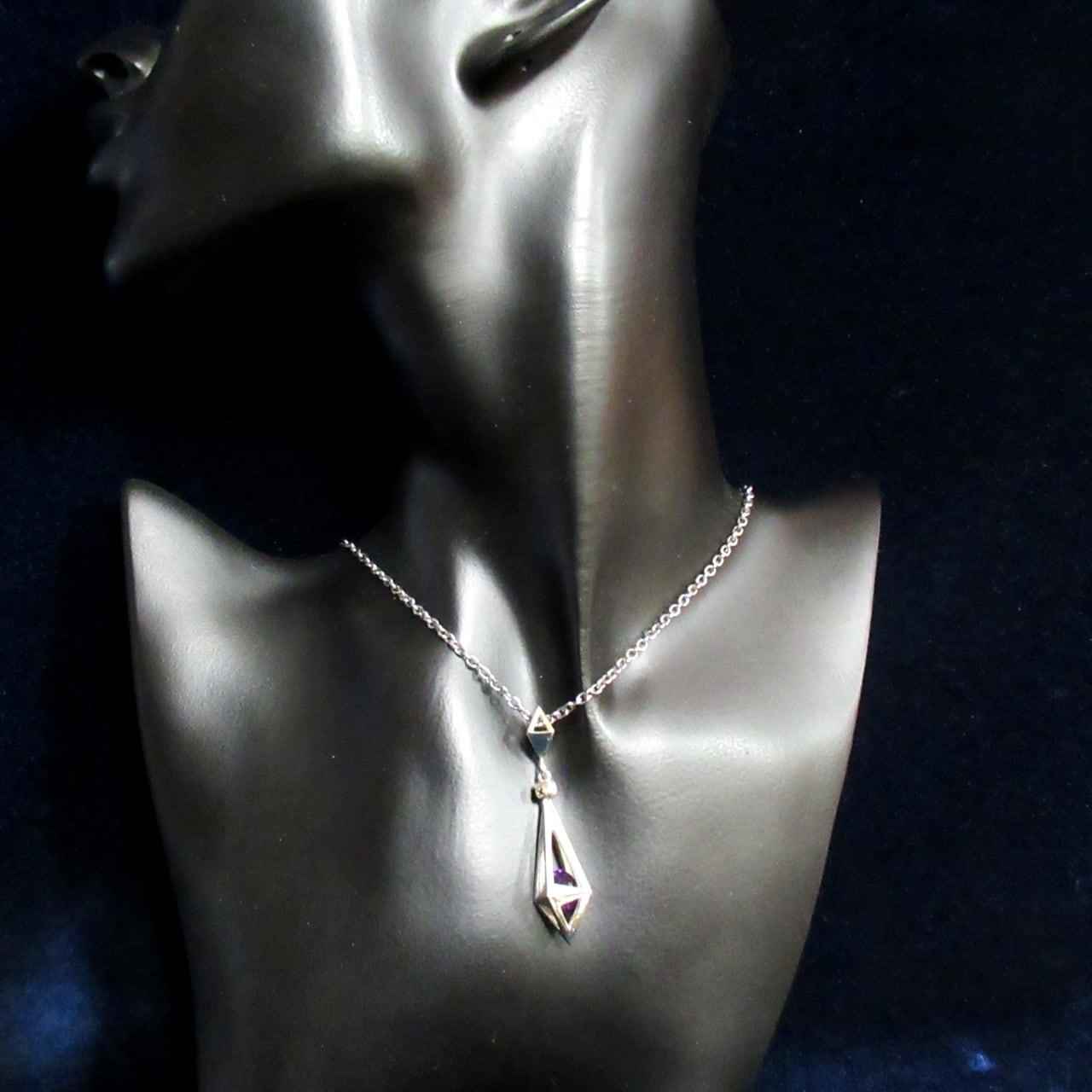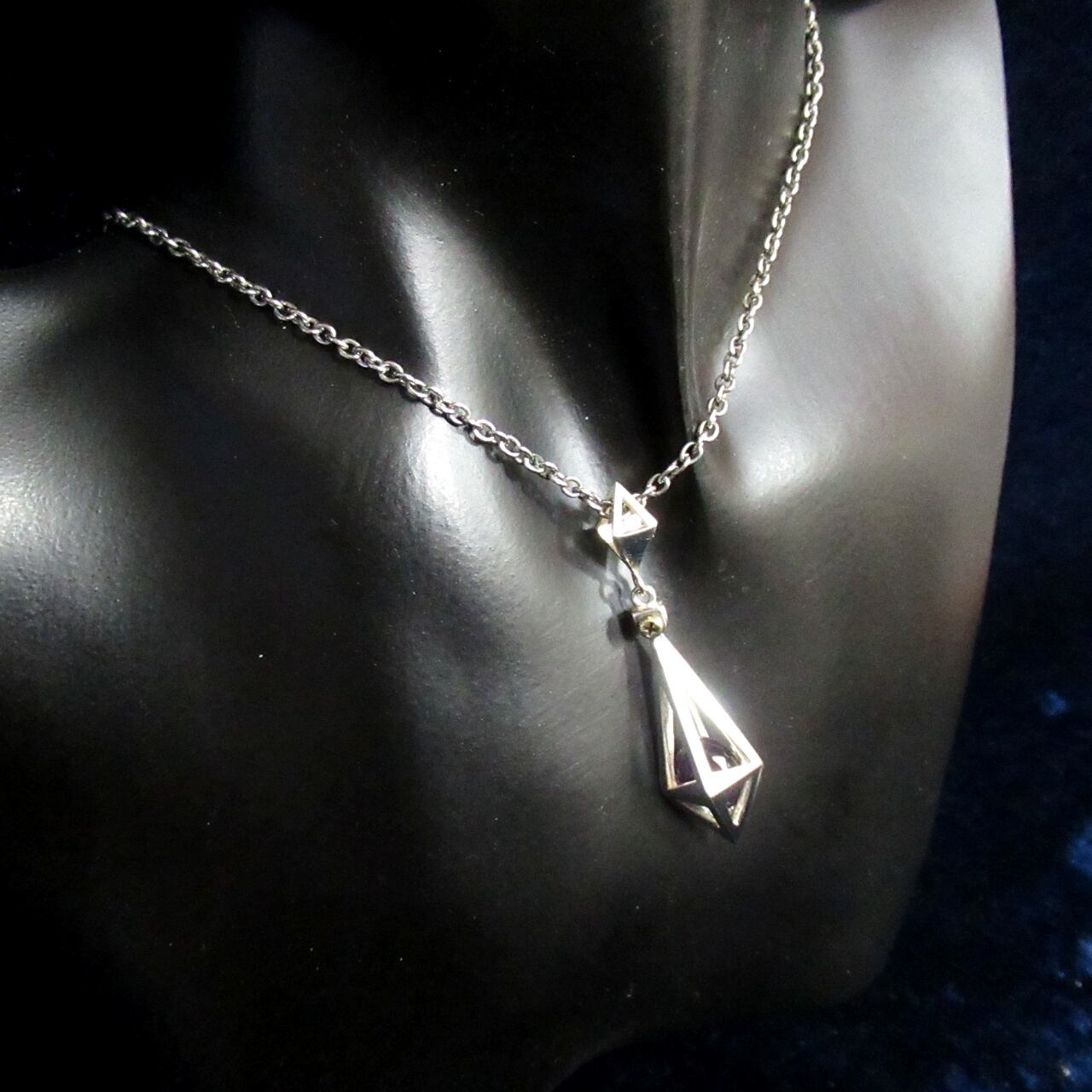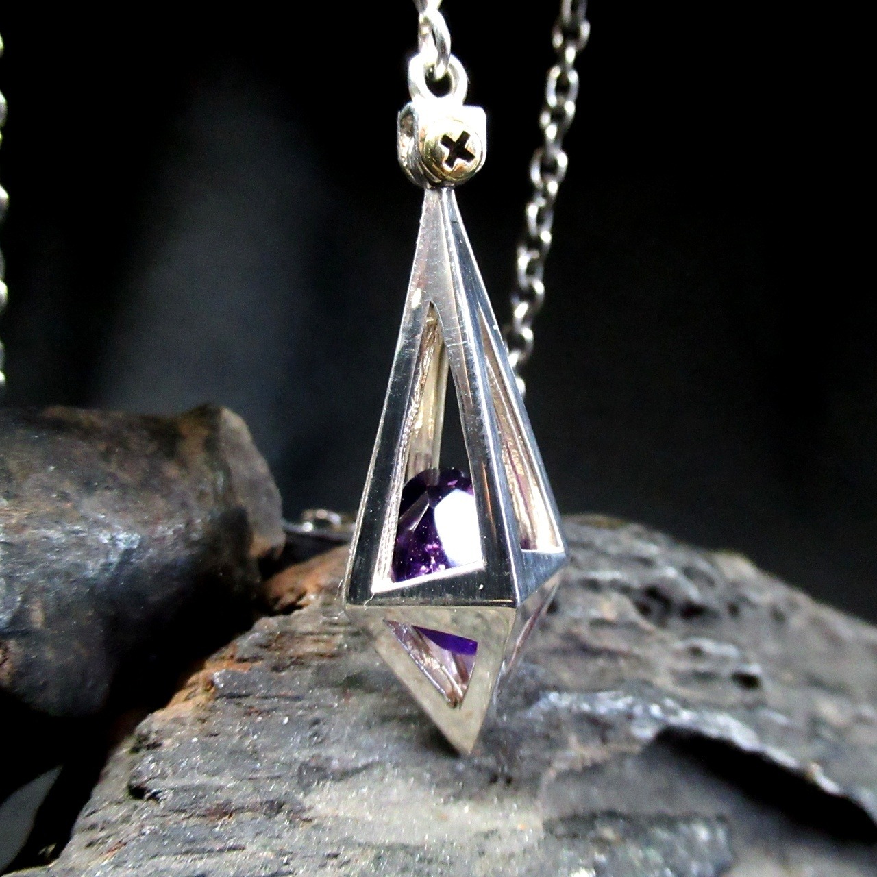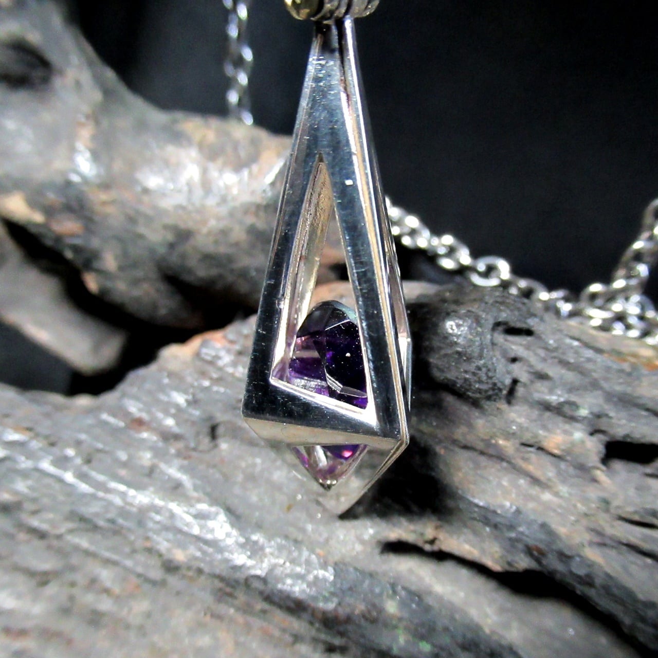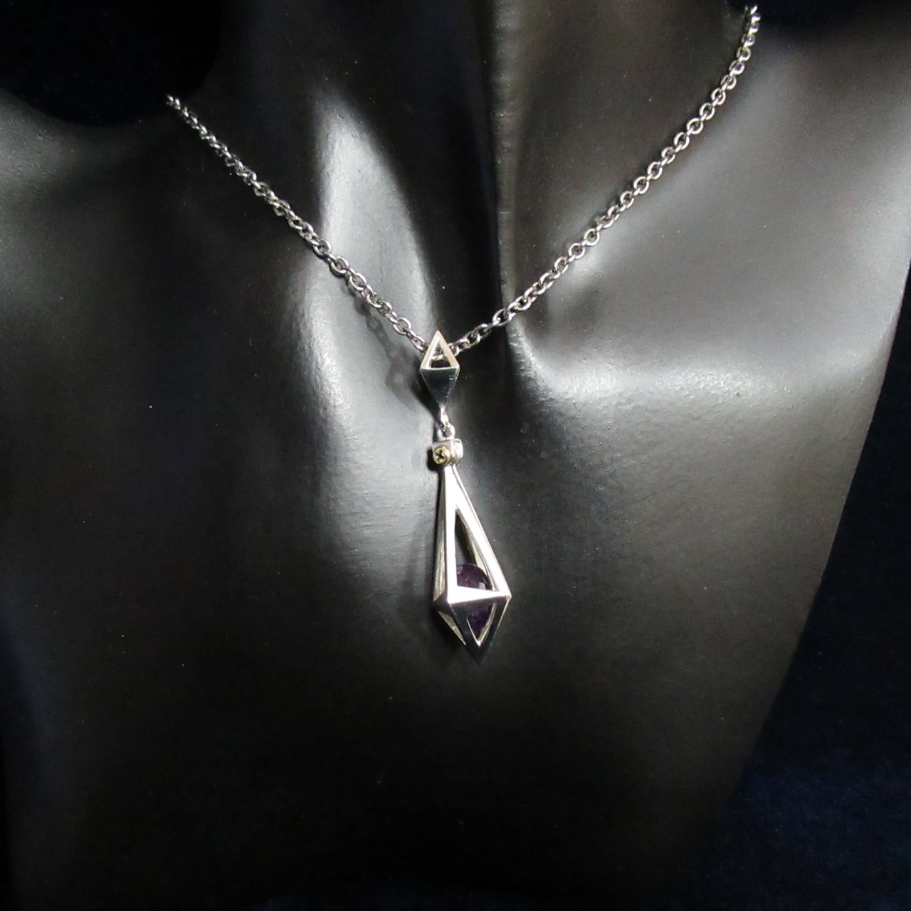 ケージに入れられたストーンが神秘的で、クールな印象を与えてくれるペンダント。