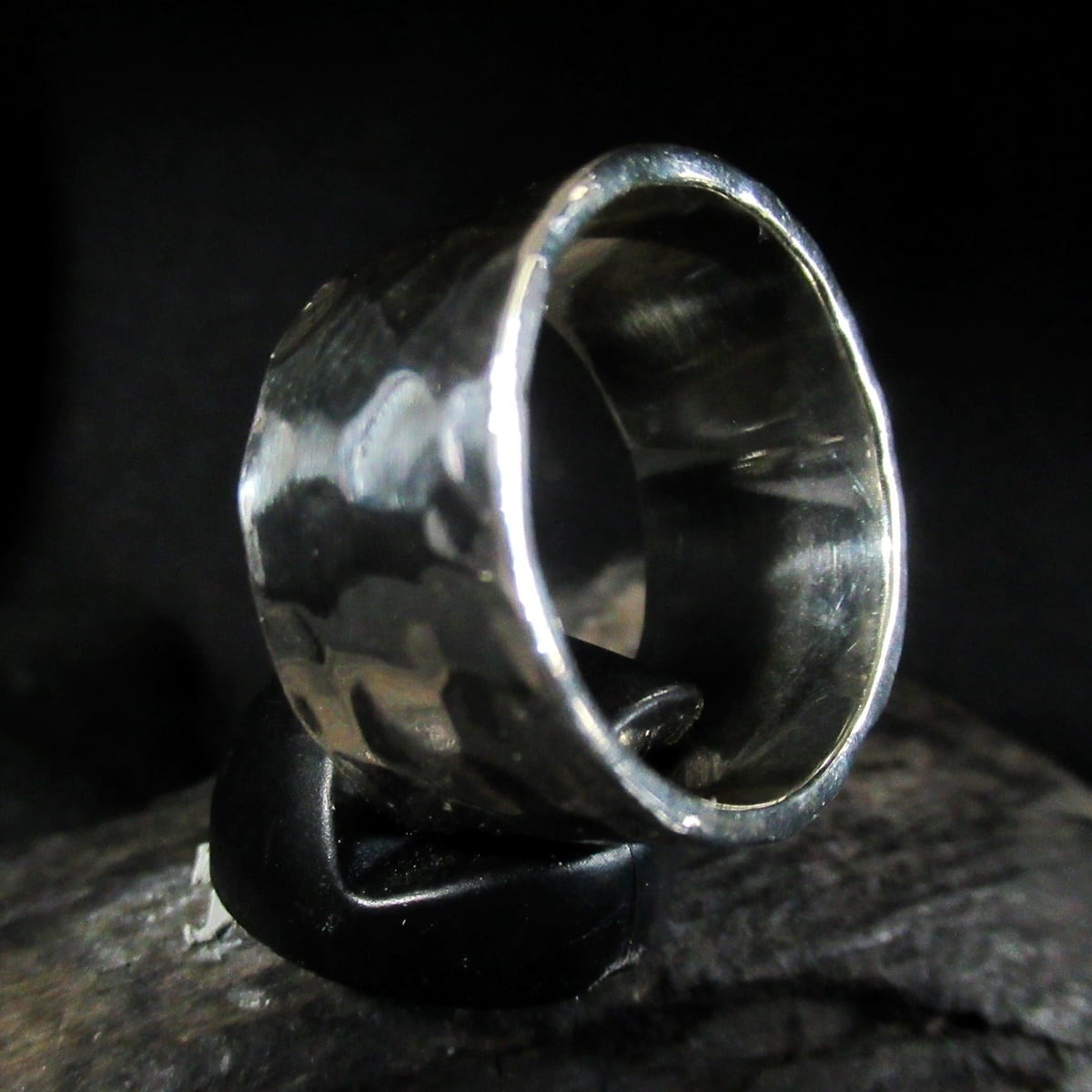シンプルで幅広なリングに金槌で叩いたときに出来る紋様の処理を施しました。