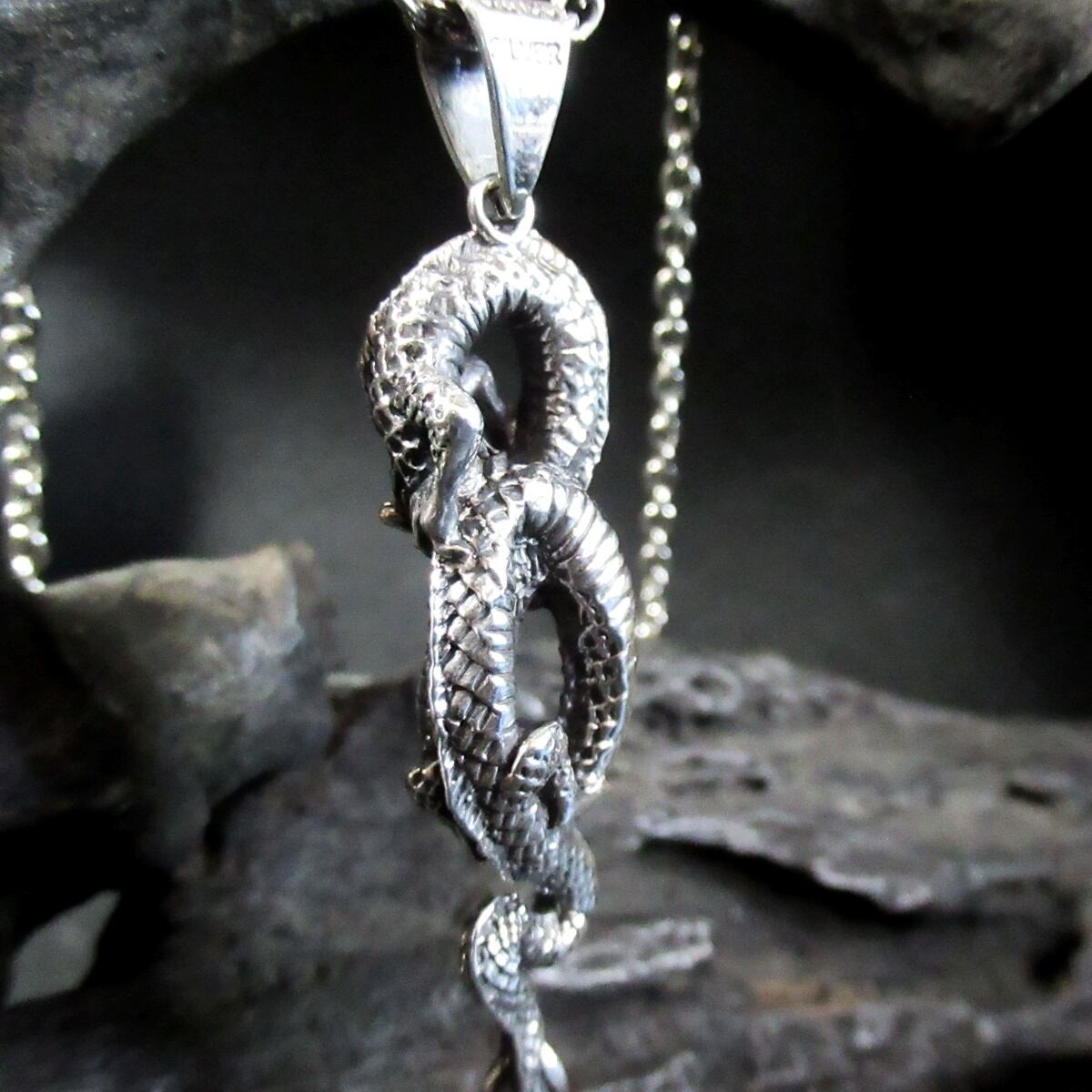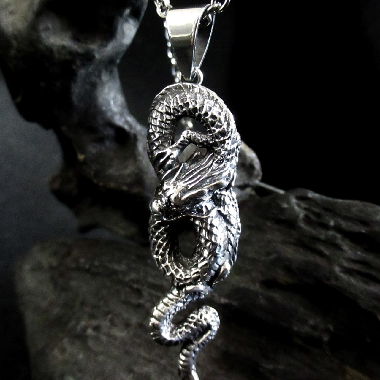 全長約50mmの大き目なサイズのモチーフに、鱗の一つ一つにいたり、細部まで創り込まれた龍が迫力のペンダントになります
