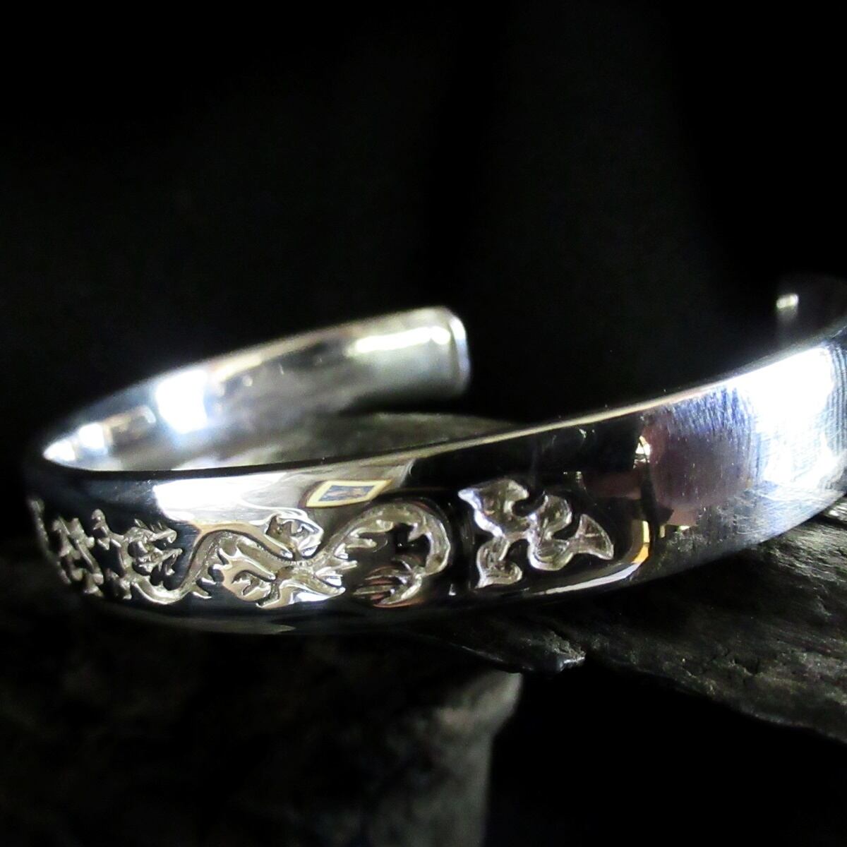 一筆で描かれた龍がバングル表面に彫り込まれたシルプルなデザインを彫り込んだタイプなのでひっかかりもなく、